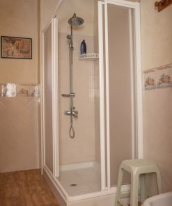 Un cuarto de baño con un plato de ducha, que han de compartir los huéspedes y que también ofrece juegos de toallas.