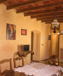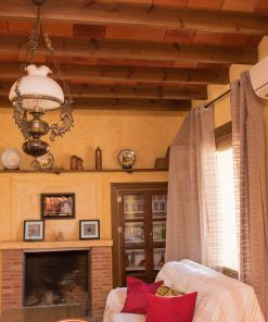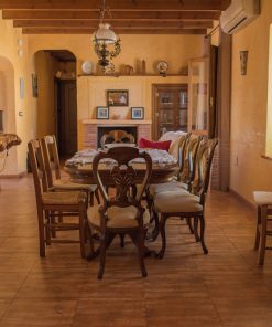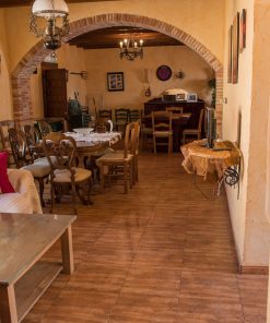 El salón comedor es el sitio más indicado para reposar y mantenerse caliente. Tenemos, en el primer ambiente, una chimenea y una televisión, espacios hacia los que se orientan los sofás. A continuación, una mesa de madera con sillas, en las que os podéis sentar a charlar o a comer, habiendo espacio para todos nuestros huéspedes.